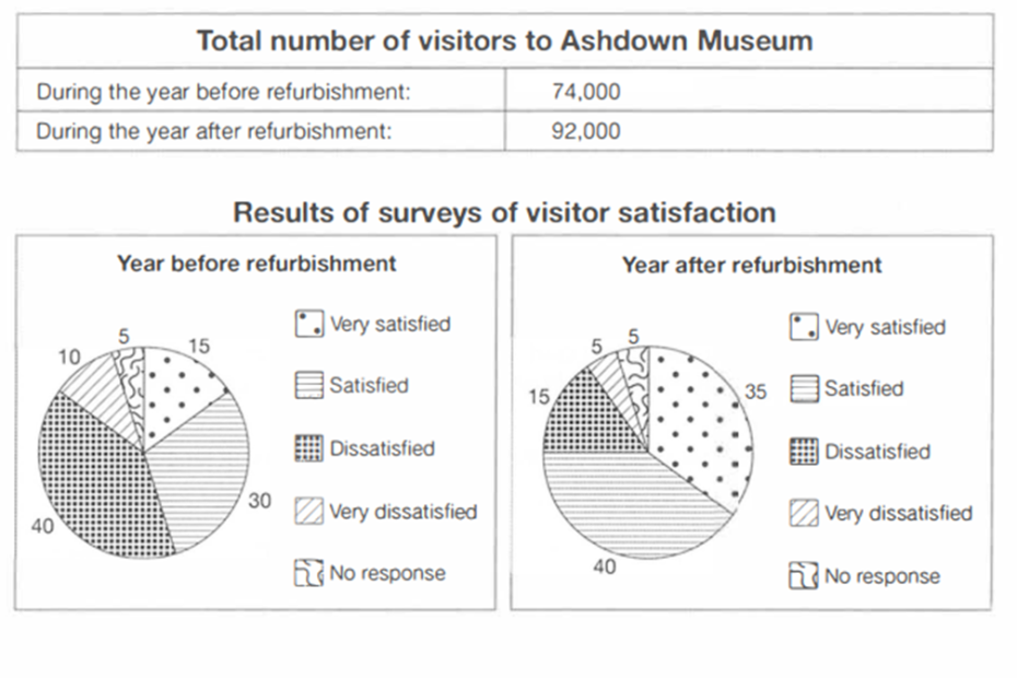 The table below shows the numbers of visitors to Ashdown Museum during the year before and the year after it was refurbished. The charts show the result of surveys asking visitors how satisfied they were with their visit., during the same two periods.